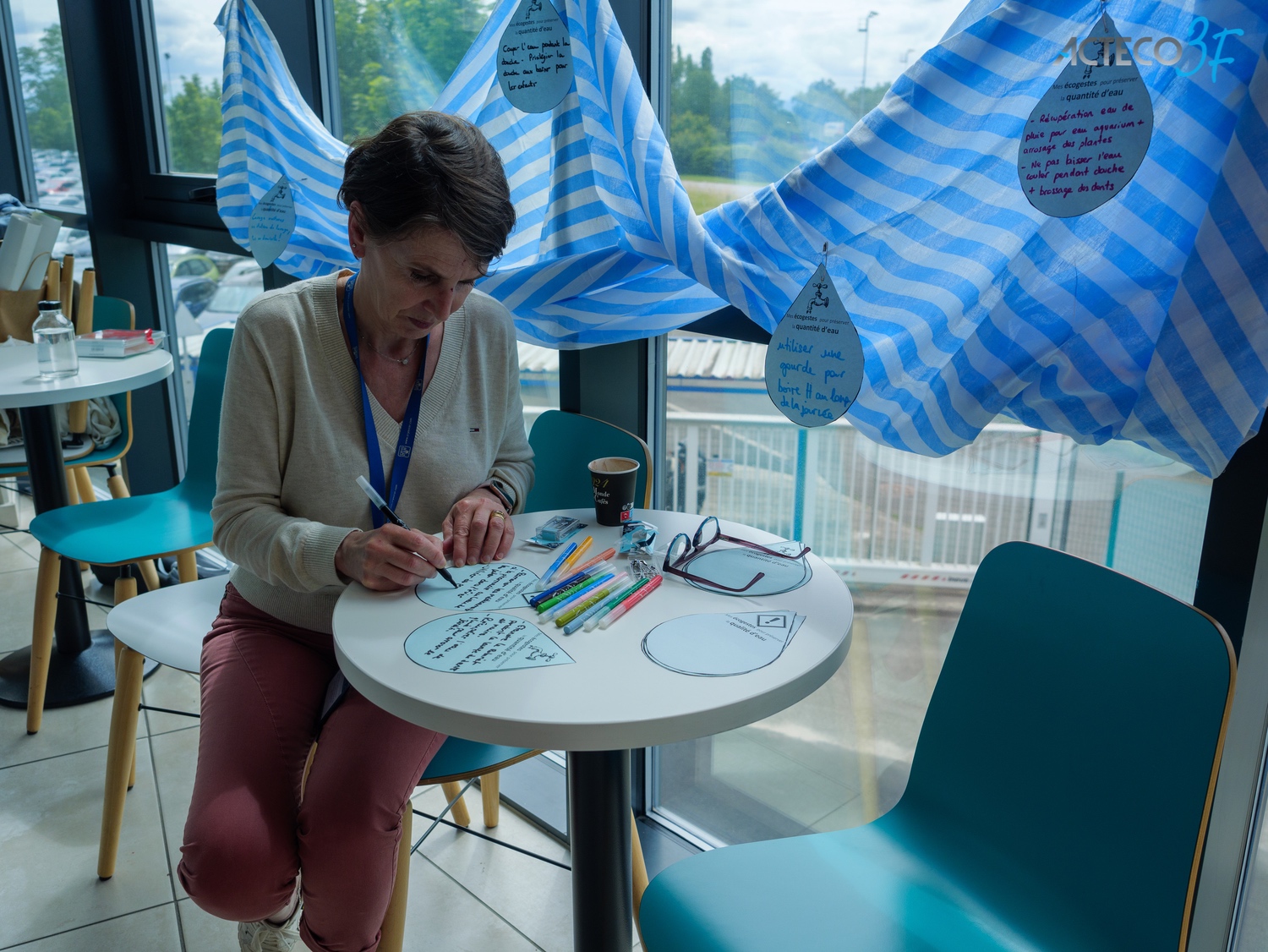 Pour clôturer, l’atelier « La rivière des éco-gestes » invite chacun à réfléchir aux actions déjà entreprises pour économiser l’eau et réduire sa pollution. Les participants notent leurs idées sur des gouttes d’eau en papier et les accrochent à une rivière symbolique en tissu bleu. Cet exercice renforce l’engagement personnel et collectif envers une gestion plus durable de l’eau.